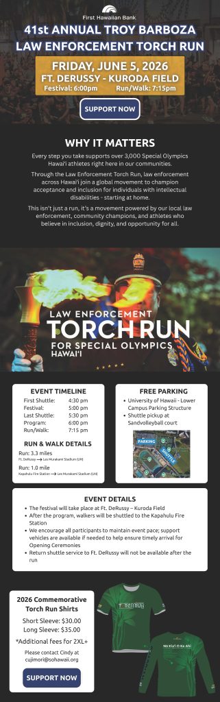 The Law Enforcement Torch Run is more than a run—it’s a year-round movement supporting Special Olympics Hawai‘i. Over 2,500 law enforcement officers from federal, military, state, and local agencies carry the Flame of Hope across Kauai, Maui, Hawai‘i, and Oahu, culminating in the Final Leg at the State Summer Games.
